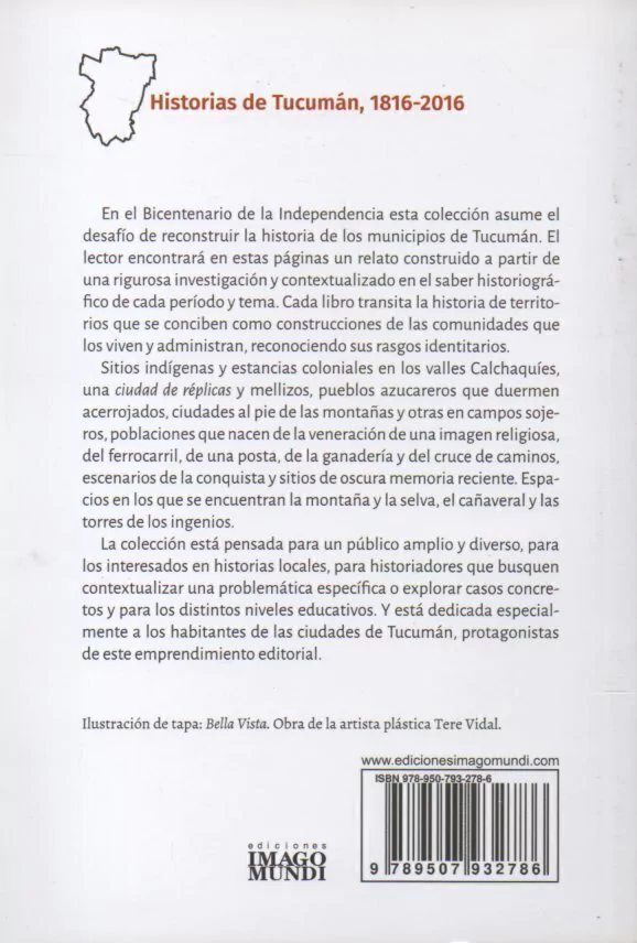 Sinopsis: En el Bicentenario de la Independencia esta colección asume el desafío de reconstruir la historia de los municipios de Tucumán. El lector encontrará en estas páginas un relato construido a partir de una rigurosa investigación y contextualizado en el saber historiográfico de cada período y tema. Cada libro transita la historia de territorios que se conciben como construcciones de las comunidades que los viven y administran, reconociendo sus rasgos identitarios.