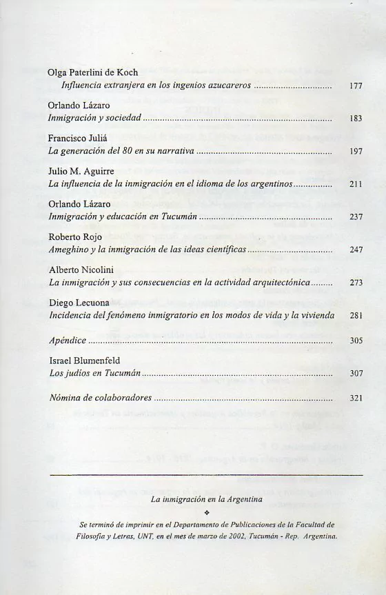 Pero, ¿hasta qué punto el argentino medio tiene conciencia del heterogéneo y reciente origen de algunos de sus modos de vida y de su cultura? El entonces 'Centro de Historia y Pensamiento Argentinos' de la Facultad de Filosofía y Letras de la UNT juzgó que - a los 100 años de la Ley de Colonización e Inmigración - el tema merecía ser abordado como parte de una tarea convergente. Se congregaron así investigadores de dentro y fuera de la UNT, procedentes de distintas especialidades y que, de modo independiente, tenían ya trabajos en marcha. Diversas perspectivas - historia política y social, demografía, geohistoria, ciencias, literatura, lingüística, artes plásticas, urbanismo, historia de la religión, de la educación y de la arquitectura ..., se nuclearon naturalmente en tomo del único, aunque amplísimo y multifacético tema de la 'Inmigración en la Argentina'.