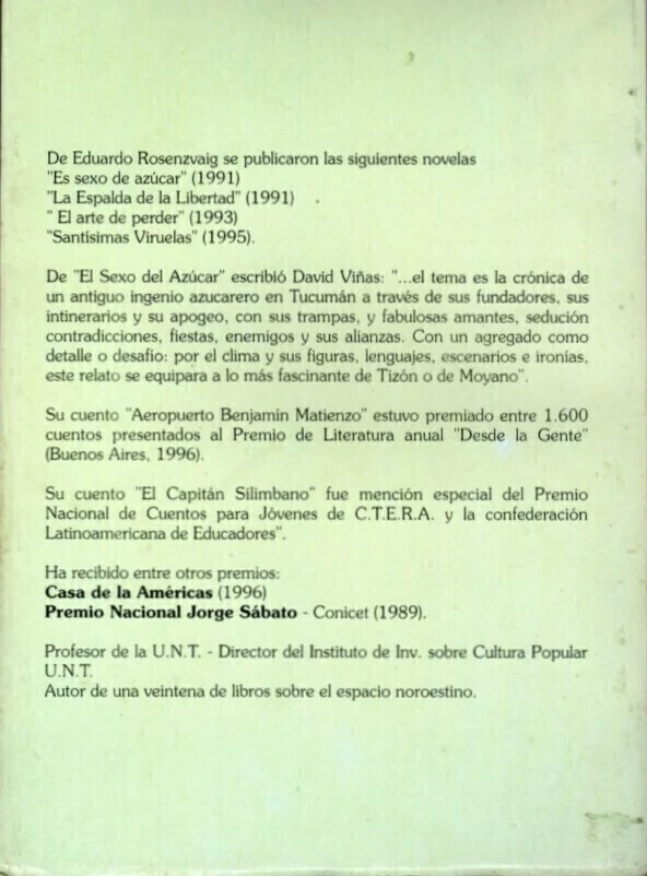 De Eduardo Rosenzvaig se publicaron las siguientes novelas "Es sexo de azúcar" (1991) "La Espalda de la Libertad" (1991) "El arte de perder" (1993) "Santísimas Viruelas" (1995).